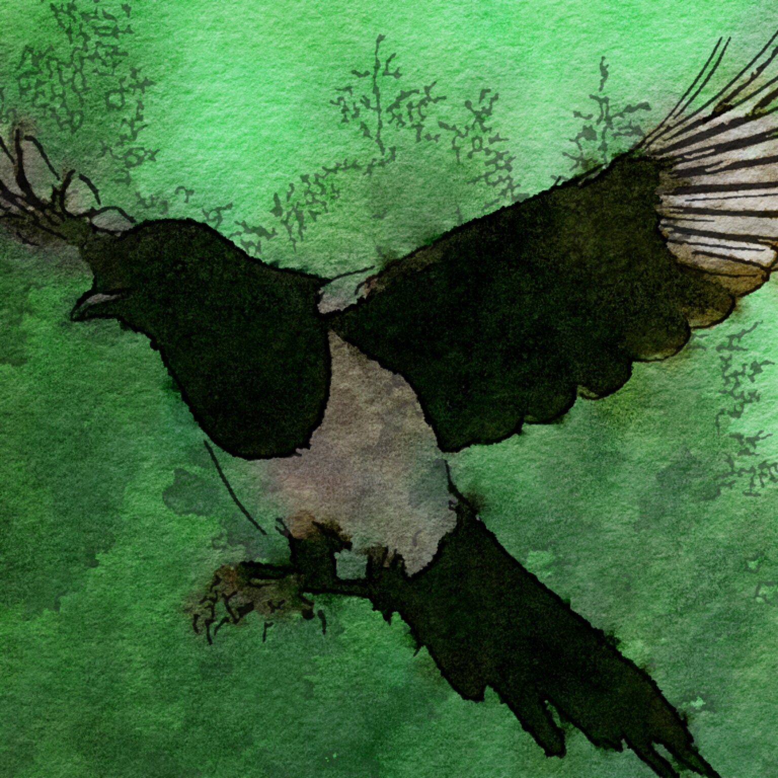 The Common Magpie, or Pica pica, is a member of the crow family, Corvidae or corvids, highly intelligent omnivores and capable of using tools. There are twenty species worldwide. They tend to be monogamous and have been reported to feel grief. They are quite large birds, up to 18 inches long, with a wingspan of up to two feet. Magpies are classically dominantly black and white, with the black glossy and showing a sheen of green and violet on the head and body, and with a sheen of green and purple on the wings, and green and reddish brown on the tails. The ‘mag’ is commonly thought as derivative from Margaret, Mags which is representative of women who are supposed to chatter, one of the sounds made the bird, and the ‘pie’ or ‘pied’ denotes two colours. Another name is ‘Treepie’.