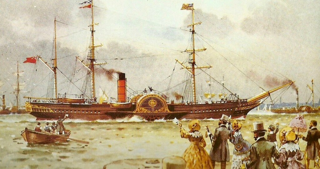 On 4 January 1842, Charles Dickens left Liverpool with his wife and her companion on the RMS Britannia. The Britannia was the flagship of the embryonic Cunard Line. She was build in Greenock, Scotland in 1840 and was the first of four paddle steamers of this class. The Arcadia, the Caledonia and Columbia soon followed. They were wooden paddle ships with three masts, and were effectively scaled down versions of the Great Western in design.