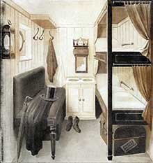 The Britannia Class could carry 115 passengers in a single class, with 80 sailors. There was one long deck house which served as a dining room, and the only other public room was a small Ladies Room. Also on deck was the housing for the cow, and with upside down boats covering the store of vegetables. The cabins were very small, rectangular rooms with space for two berths, one on top of the other, like bunk beds.